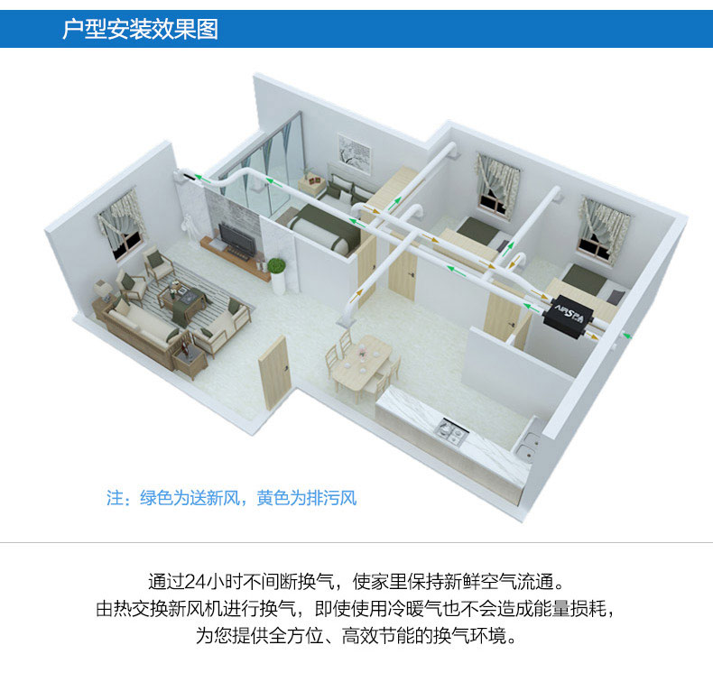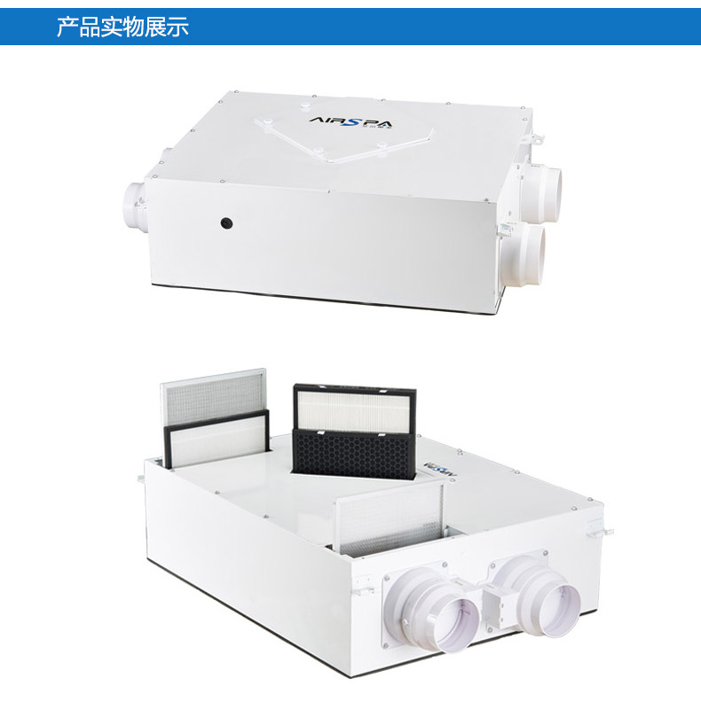 雙向流新風機:訂機采用雙核動力設計,動力強,體積??;采用直流無刷電機,低噪音,低能耗
