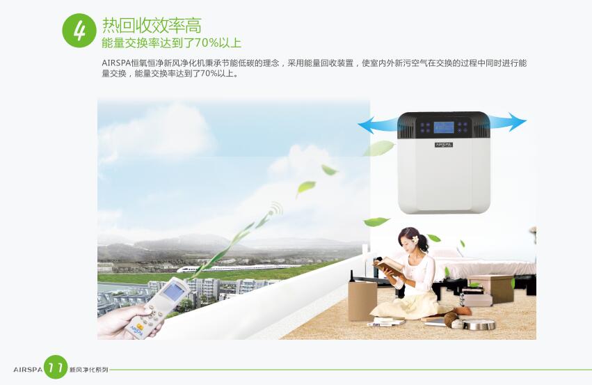 AIRSPA恒氧恒凈新風凈化機秉承節(jié)能低碳的理念,采用能量回收裝置,是室內(nèi)外新污空氣在交換的過程中同時進行能量交換,能量交換率達到了70%以上。