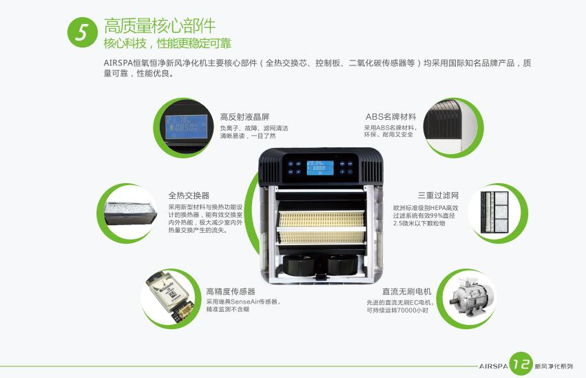 AIRSPA恒氧恒凈新風凈化機主要核心部件(全熱交換芯、控制板、二氧化碳傳感器等)均采用國際知名品牌產(chǎn)品、質(zhì)量可靠、性能優(yōu)良。